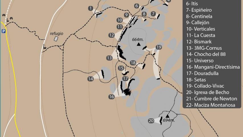 Nestes últimos anos, a limpeza do mato na ladeira oeste deixou ao descuberto unha serie de rochas, non moi altas, mais ideais para a práctica da escalada de bloque e boulder, escalada na que non é preciso arneses nin cordas xa que non se sube a moita altura e onde a protección cóbrese coa colocación por parte do escalador e do colchón que amortecen a posible caída ao chan. É unha escalada que non deixa ningún tipo de residuo nin material instalado na rocha, deixando totalmente limpo o monte a nosa marcha.