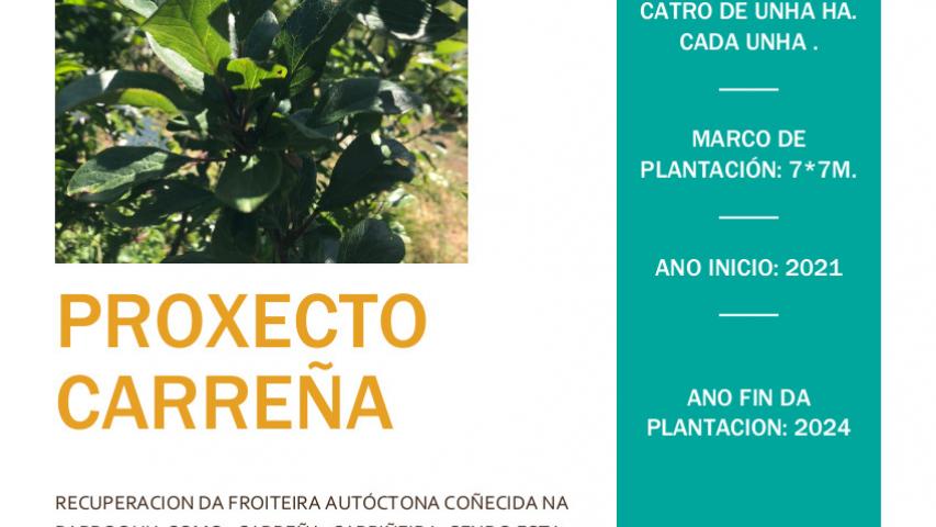 A carreña é unha froiteira moi apreciada pola veciñanza da parroquia polas súas cualidades. Hoxe en día é unha especie habitual nas leiras pero vai a menos dun xeito claro. Aproveitando eses pés existentes nas casas, e coa colaboración dos veciños fíxose esta plantación que xa está implantada en algo menos dunha hectárea e con espazo para crecer ata as catro se a presión do gando o permite.